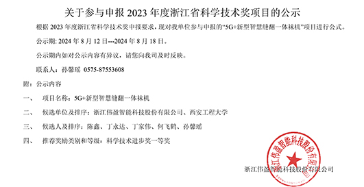 根據(jù) 2023 年度浙江省科學(xué)技術(shù)獎申報要求,現(xiàn)對我單位參與申報的“5G+新型智慧縫翻一體襪機”項目進(jìn)行公式。